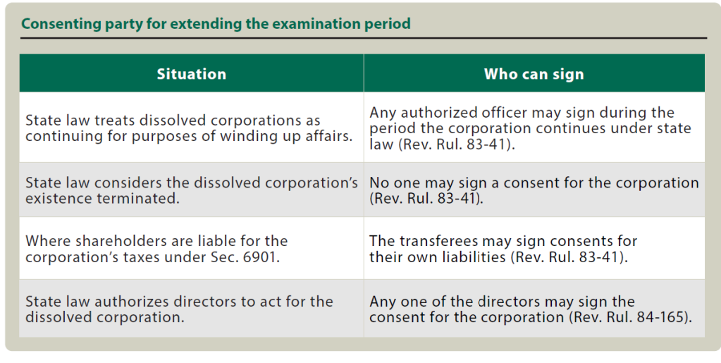 A key consideration for the IRS will be securing consent to extend the statute of limitation from the proper person. The IRS has guidance on who can sign the consent for the situations in the table “Consenting Party for Extending the Examination Period,” below.